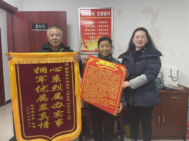在谢家集区退役军人事务局的高效推进下,《烈士证明书》迅速完成审批。工作人员将这份象征着无上荣光的证书送往武忠英老人家中。一同带去的,还有精心准备的慰问品。为表谢意,武忠英老人的家人特意送来了一面绣有“心系烈属办实事 拥军优属显真情”的锦旗和一封情真意切的感谢信,字里行间满是感动与感激。一面锦旗承载着烈属的信任,一封感谢信写满枝叶关情的厚重,既是肯定,更是鞭策。
